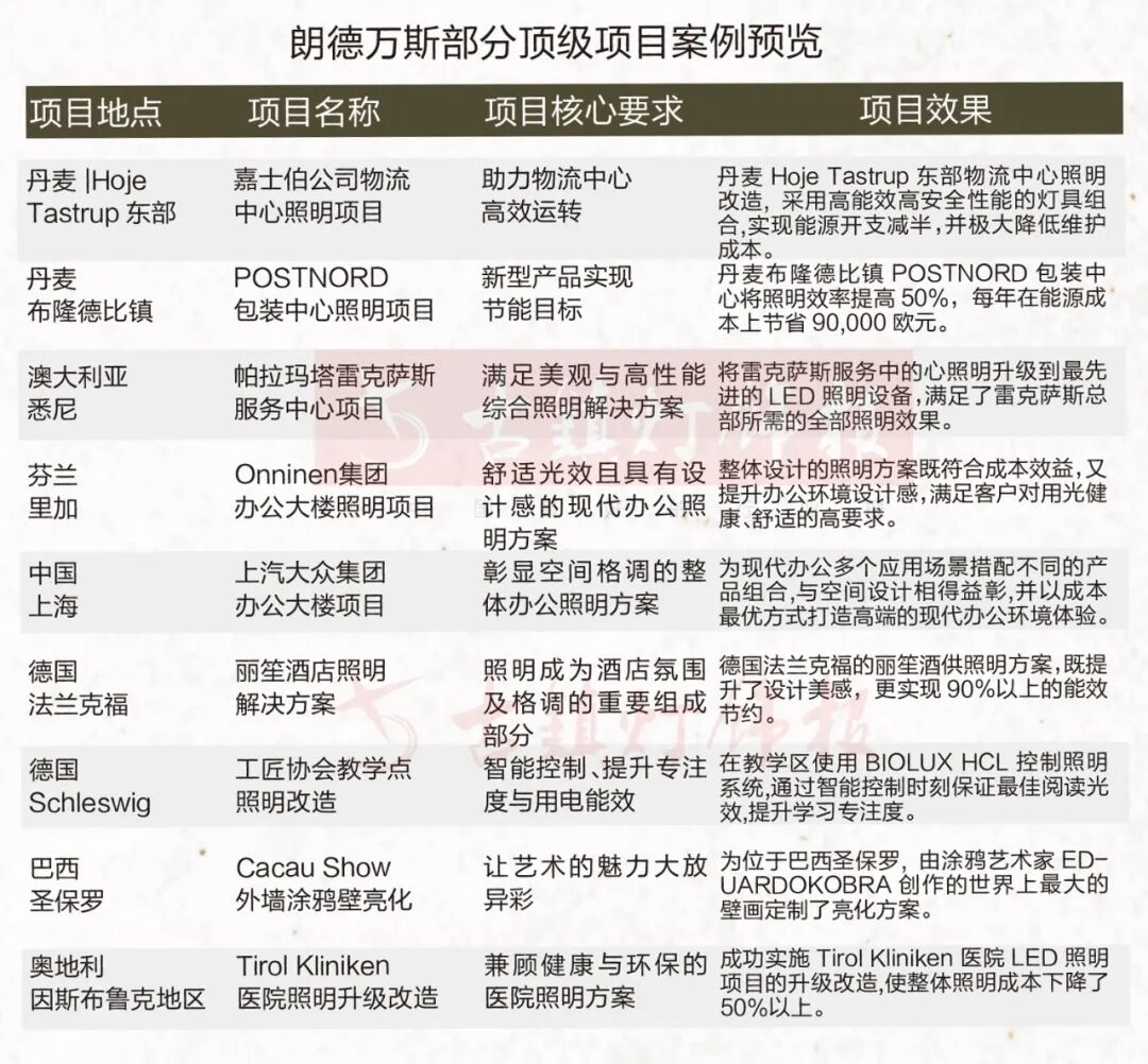 目前,朗德万斯是全球领先的通用照明产品供应商,同时服务于专业用户和零售客户。产品包括先进的LED光源、满足行业级应用及消费类的LED灯具、家居和建筑领域的智能互联解决方案,以及一系列传统光源。